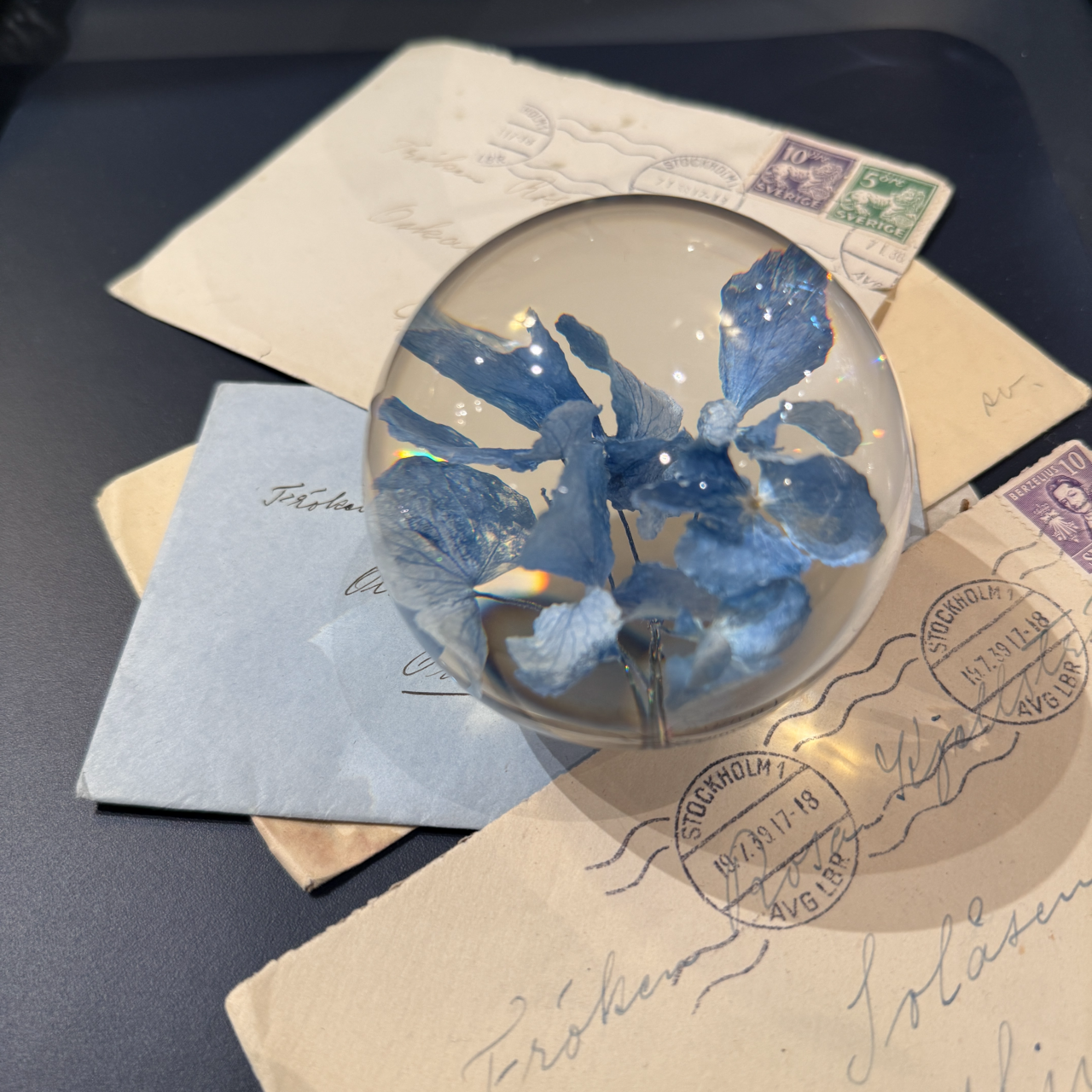 Brevpress Hortensia i resin med en riktig hortensiablomma