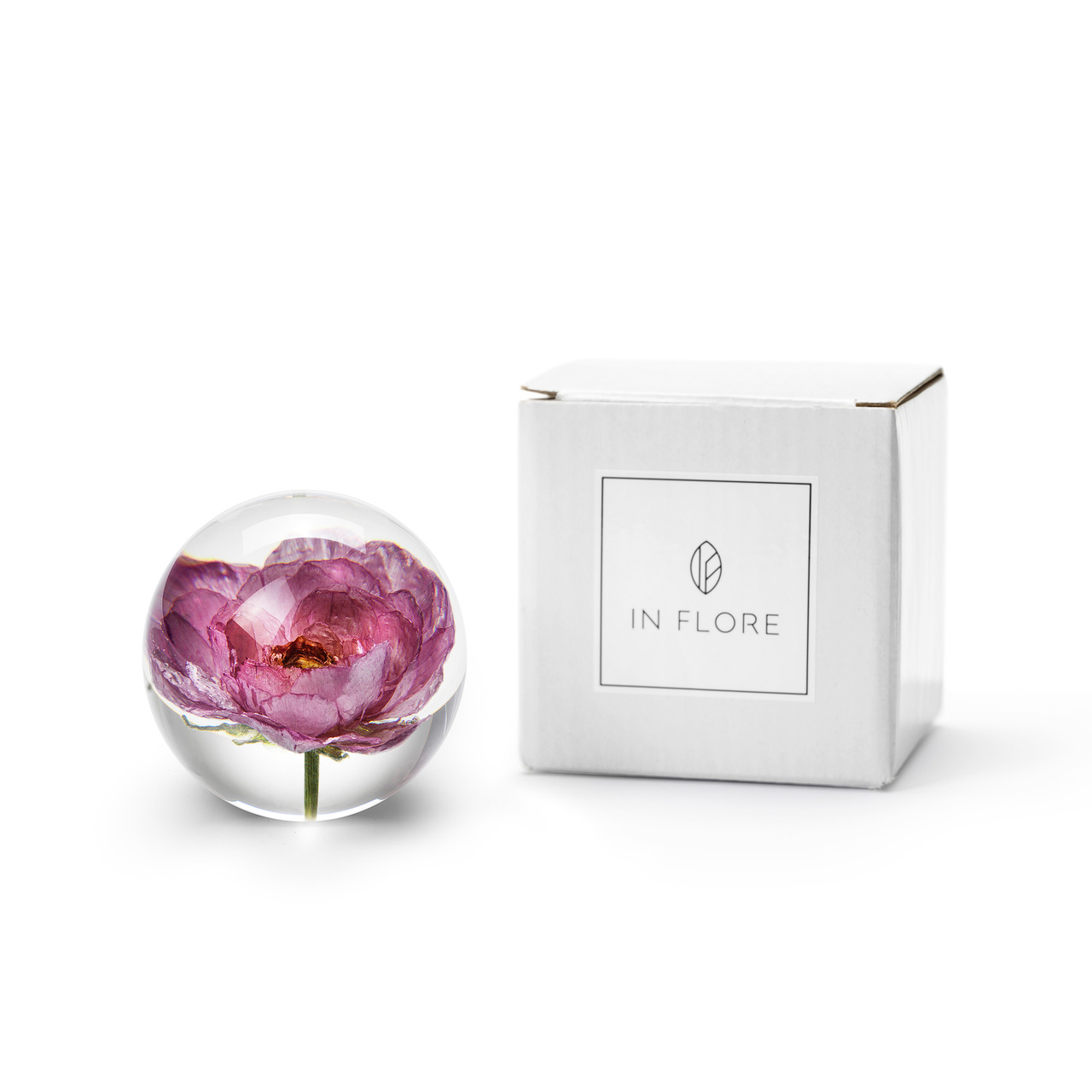 Lyft din inredning med Peony rose brevpress – en elegant pappersvikt där en äkta ranukel vackert bevarats i klar resin. Varje blomma är noggrant handplockad och naturlig, vilket gör varje brevpress till ett unikt och levande konstverk. Använd den som tyngd för brev, dokument eller böcker eller låt den bli en iögonfallande dekoration i hemmet eller på kontoret.