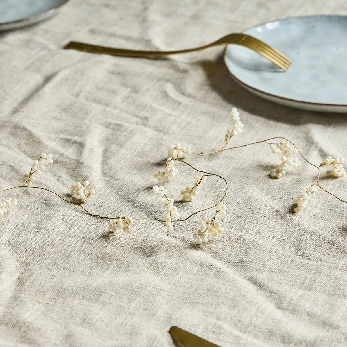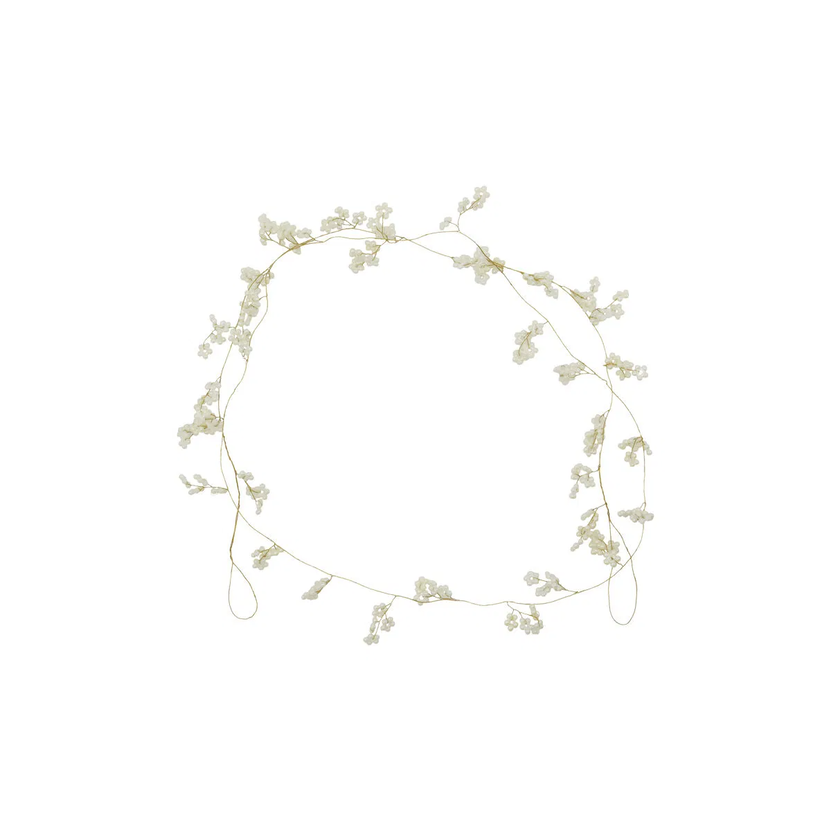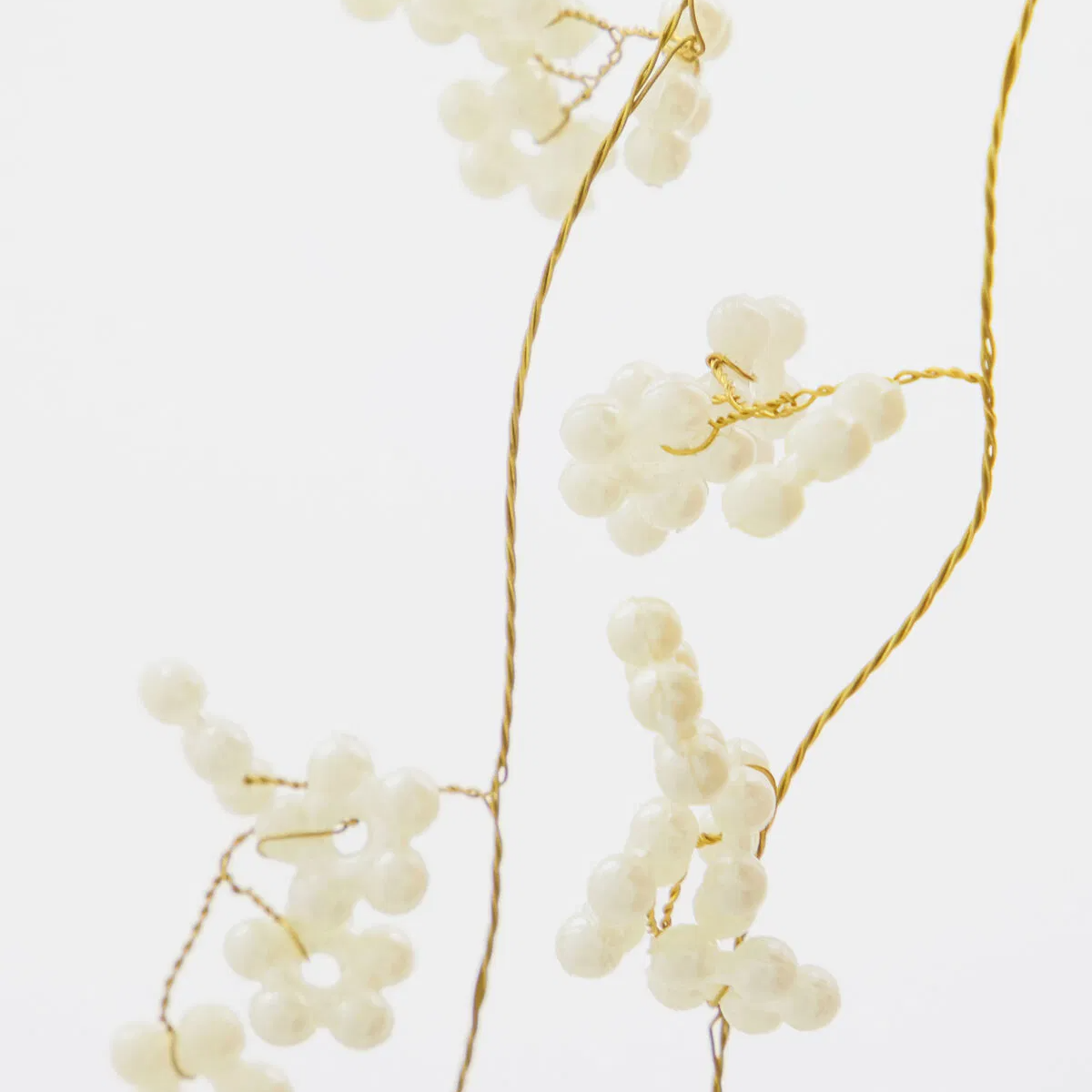 Förhöj stämningen i ditt hem med girlang pärla antikmässing, en vacker girlang med lyxig off-white och champagne-finish. Denna dekorativa girlang är gjord med gyllene metalltråd och pryds av små, samlade off-white detaljer som ger en elegant och sofistikerad känsla.