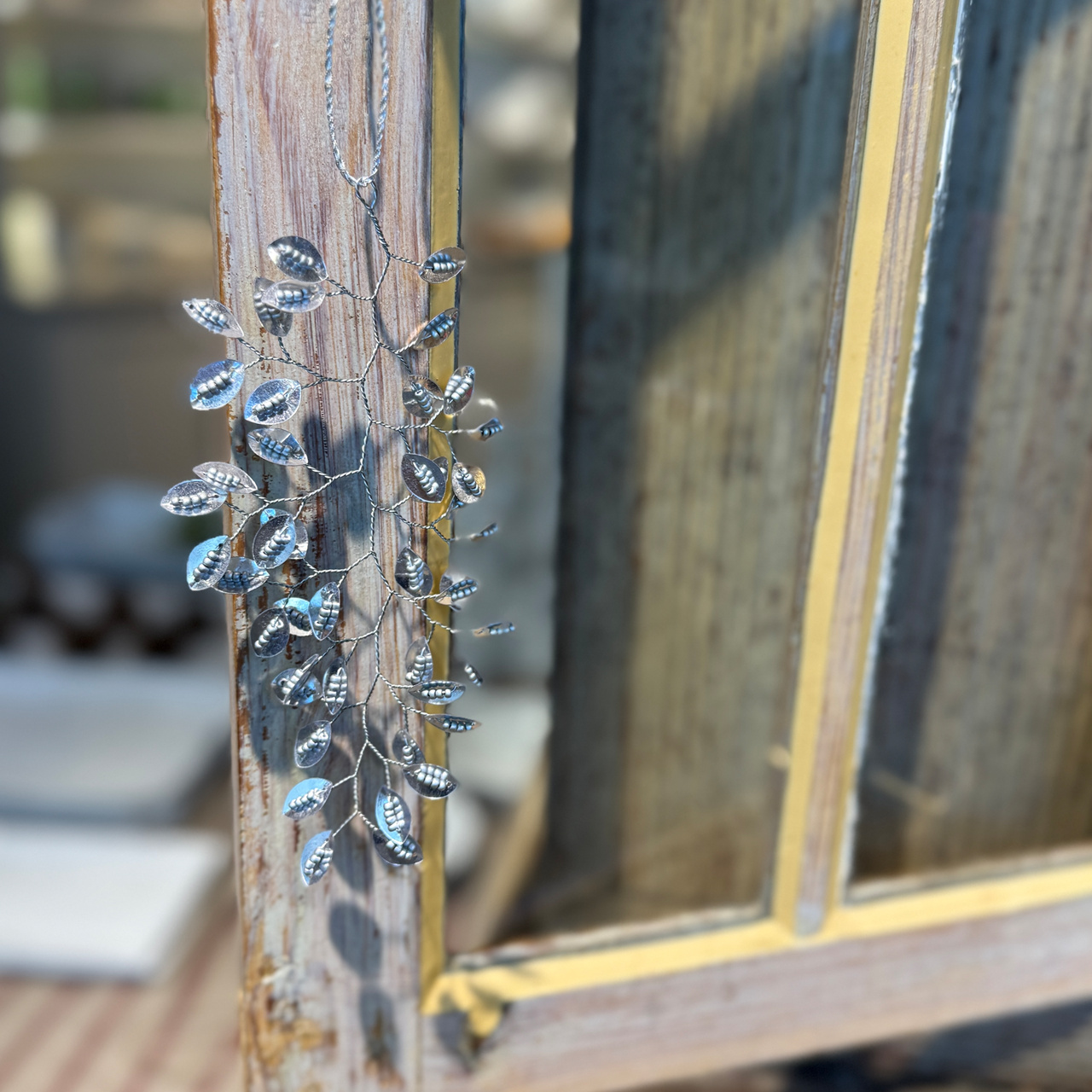 Lyft din julinredning med denna eleganta grenformade metalldekoration i silverfärg. Dekorationen är 14 cm lång och består av tunna grenar med glänsande silverblad och små dekorativa pärlor som ger ett exklusivt och gnistrande uttryck. Perfekt att hänga i julgranen, använda i kransar, eller som en del av festdukning och kreativa arrangemang.