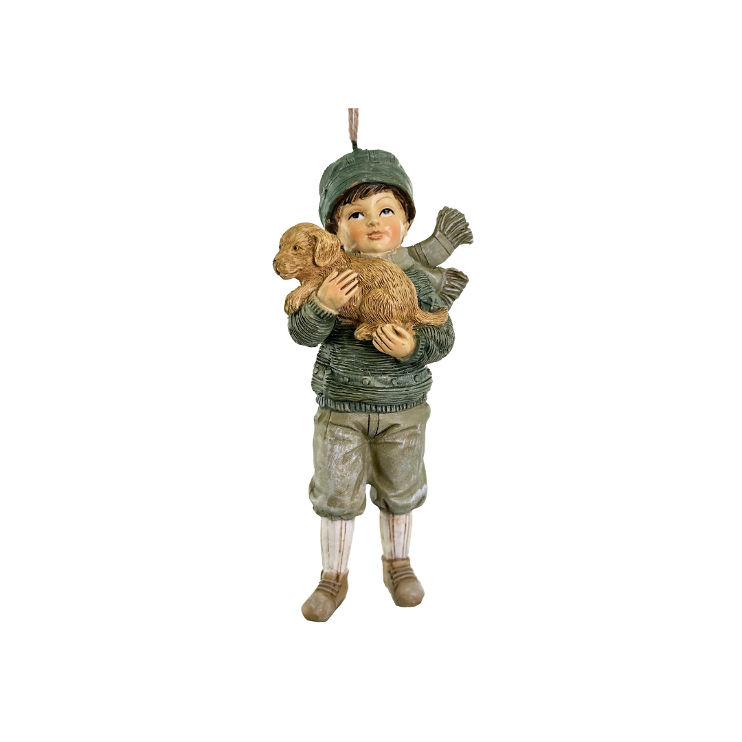Juldekoration – pojke med hund, grön‑brun finish, 11 cm