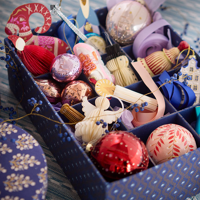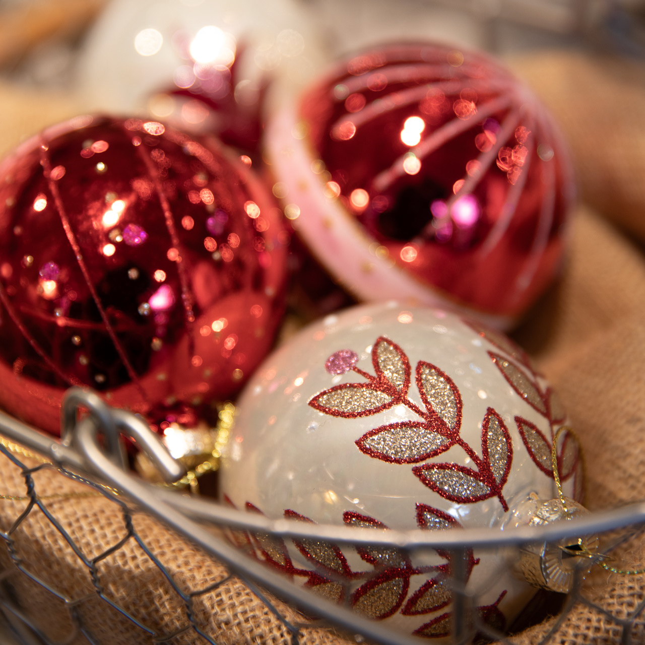 Förgyll julgranen med detta set om fyra förtrollande julkulor med handmålade glitterdetaljer. Varje kula är ett litet konstverk som sprider glans, värme och traditionell julstämning i ditt hem.