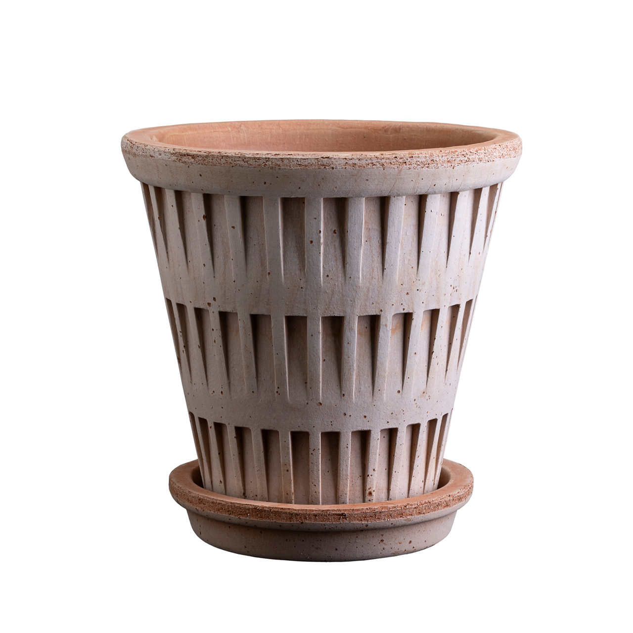 Pantheon-krukan från Bergs Potter är en stilren blomkruka i terrakotta, inspirerad av den ikoniska kupolen i Pantheon i Rom. Formgiven av Rasmus Rostrup pryds krukan av ett detaljerat reliefmönster som återger kupolens klassiska kassetter i harmoniska, symmetriska rader.