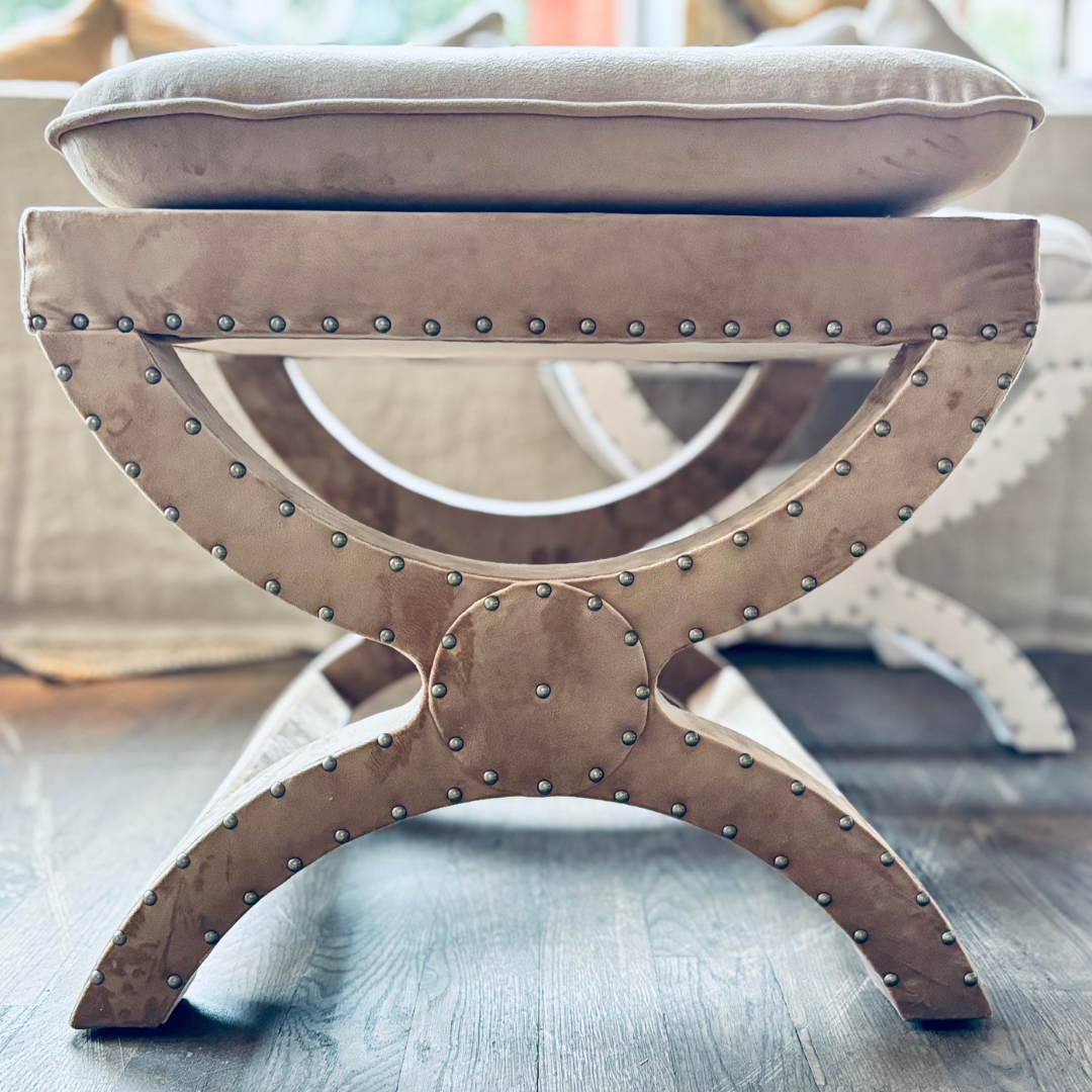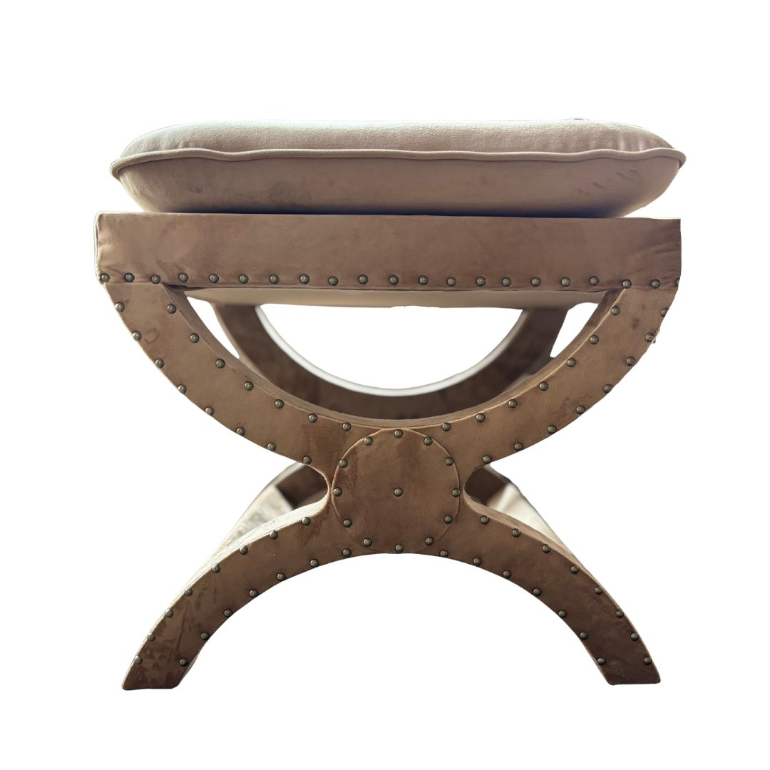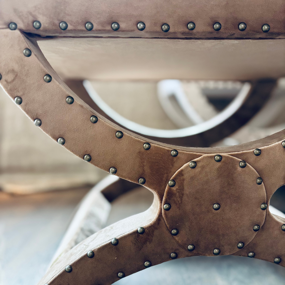 Lyft din inredning med en elegant krysspall i brun sammet, dekorerad med stilrena nitar och en bekväm sittdyna.