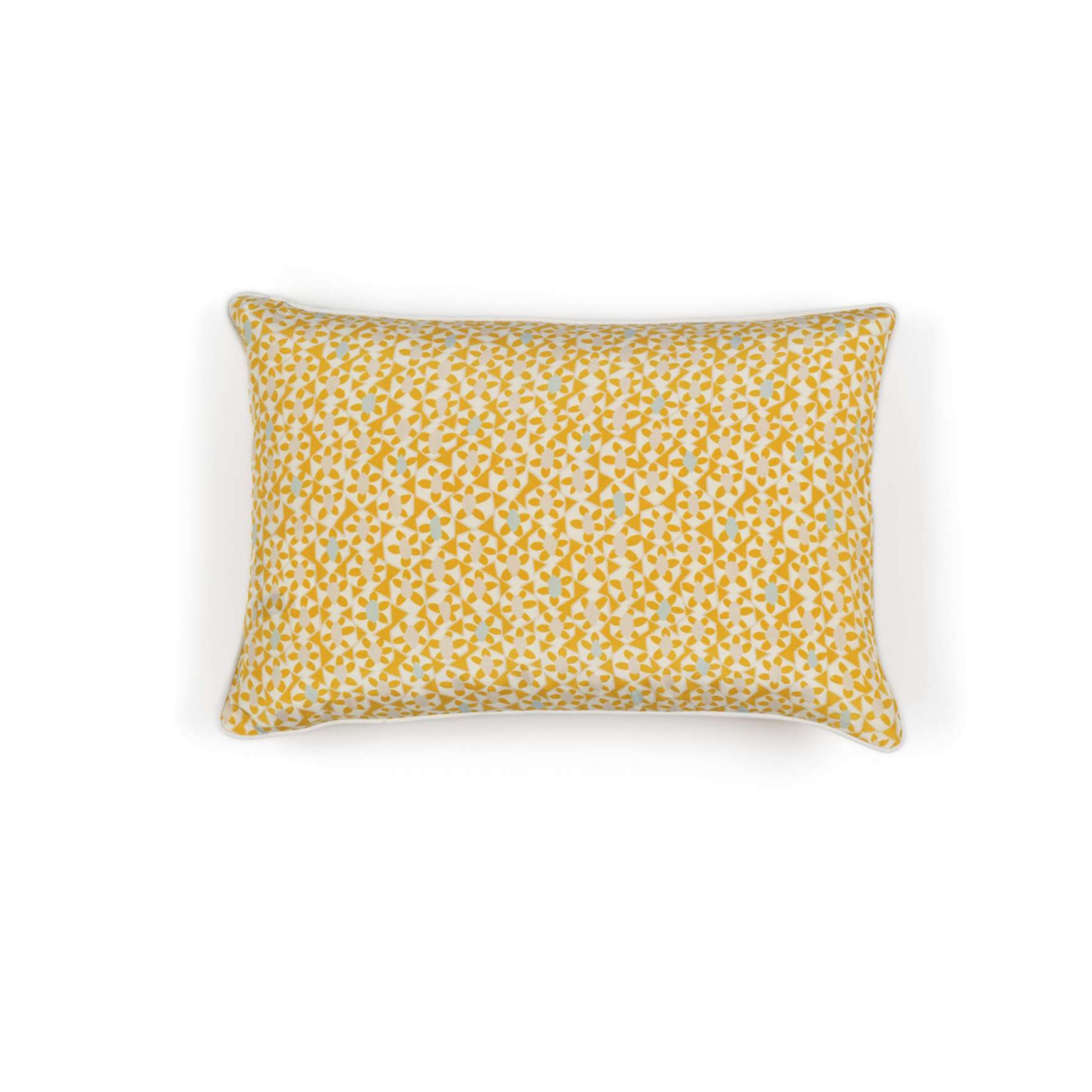 Kuddfodral Azteca Saffran från Élitis i exklusivt tryckt siden. Ett dekorativt kuddfodral med elegant mönster och varm saffransgul ton som lyfter din inredning.