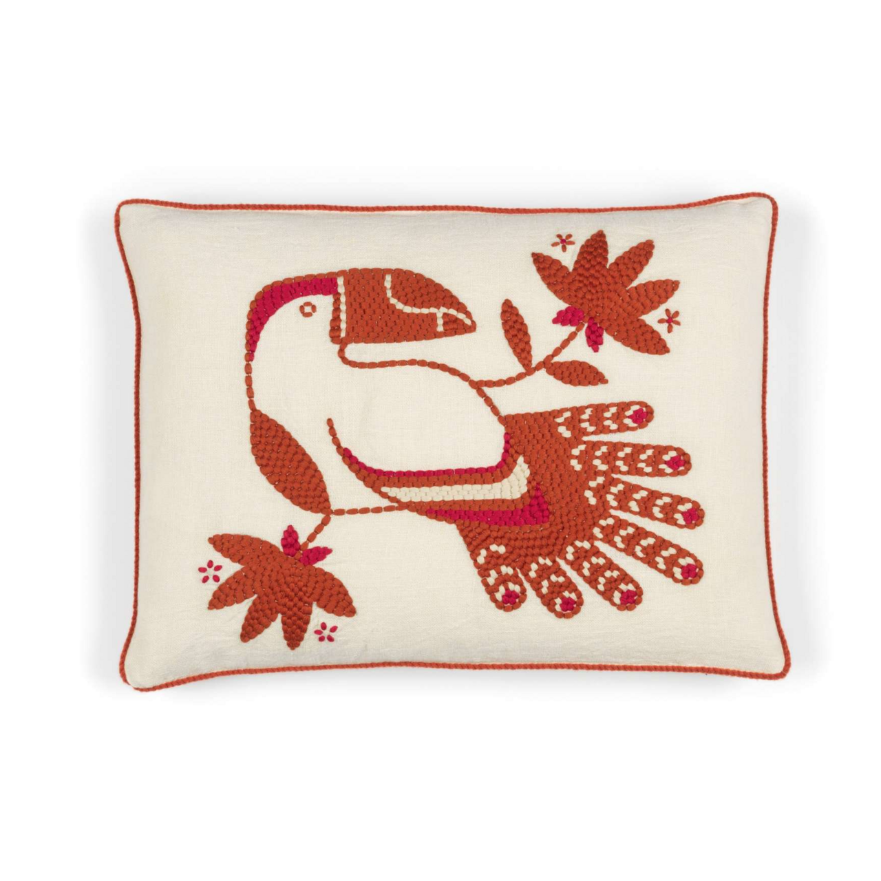 Exklusivt kuddfodral Cristobal korall från Élitis i broderat linne. Elegant design i varm röd nyans som ger ditt hem en lyxig och dekorativ känsla. Motiv av en fågel.