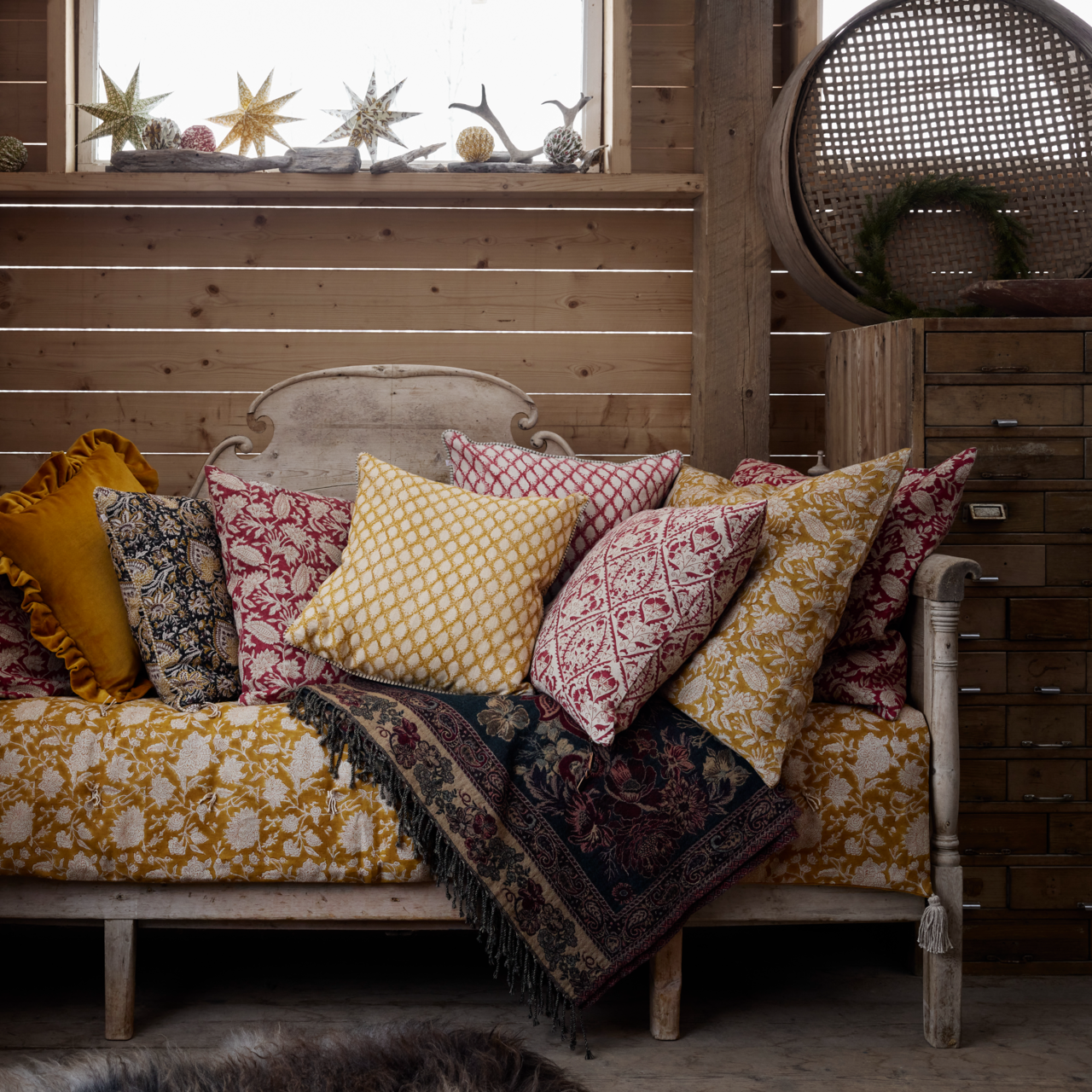 Varje del av mönstret trycks för hand med träblock av riktigt skickliga hantverkare. Chamois samarbetar med små fabriker och familjeföretag som har över 150 års erfarenhet av att använda sina ärvda kunskaper från Kashmir och andra textilområden i Indien.