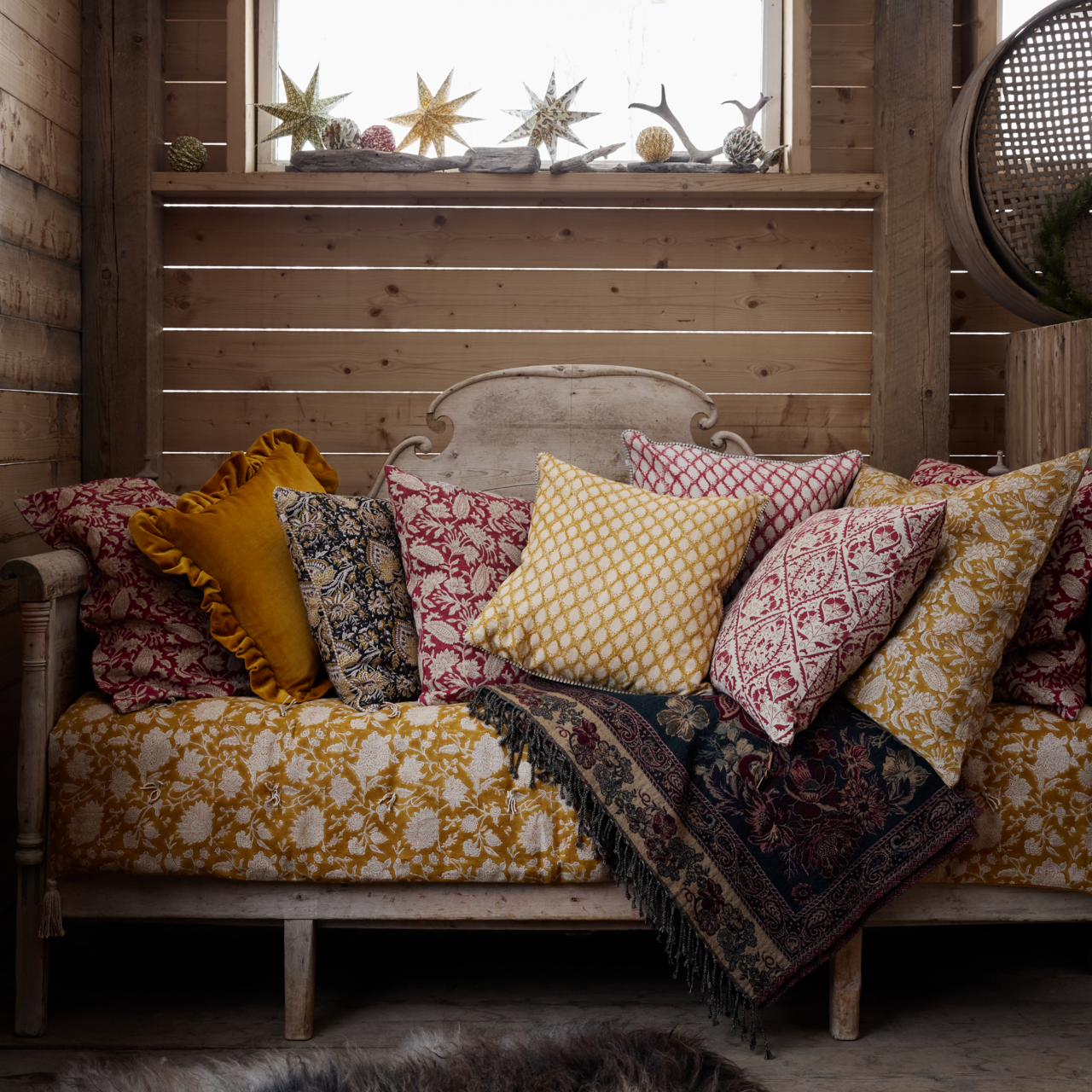 Varje del av mönstret trycks för hand med träblock av riktigt skickliga hantverkare. Chamois samarbetar med små fabriker och familjeföretag som har över 150 års erfarenhet av att använda sina ärvda kunskaper från Kashmir och andra textilområden i Indien.