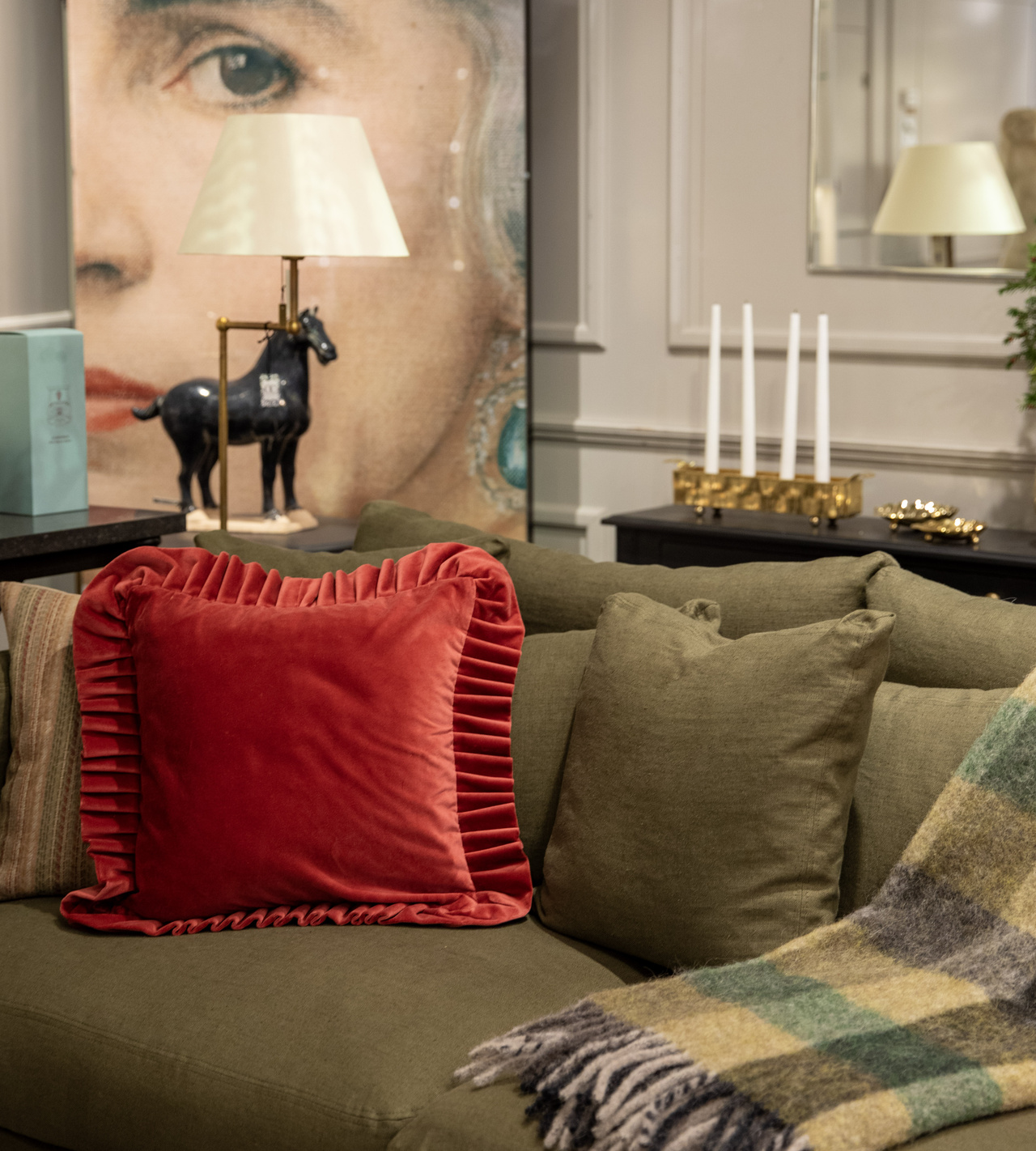 Skapa en elegant julstämning med lyxig sammetskudde i rött med en volangkant.