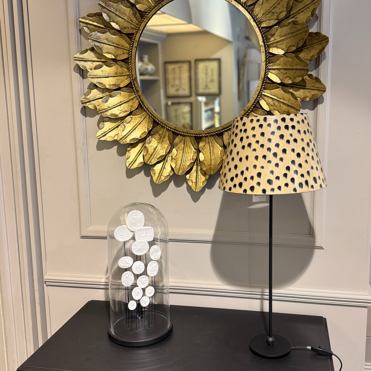 Ge ditt hem en personlig stil med denna runda lampskärm i leopardmönster, 30 cm i diameter. Den unika designen med handmålade svarta fläckar mot en beige-guldig botten skapar ett elegant och iögonfallande uttryck. Perfekt för dig som vill ha en dekorativ lampskärm med djurinspirerat mönster i vardagsrum, sovrum eller hall.