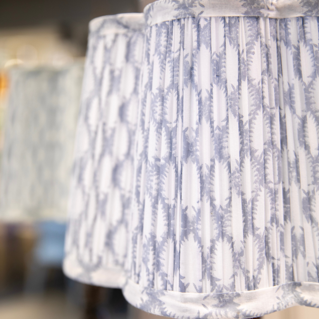 Upptäck scallop‑formade lampskärm med Cypress‑tryck i cornflower – en elegant och dekorativ detalj som ger ditt hem både karaktär och ett vackert ljusspel.