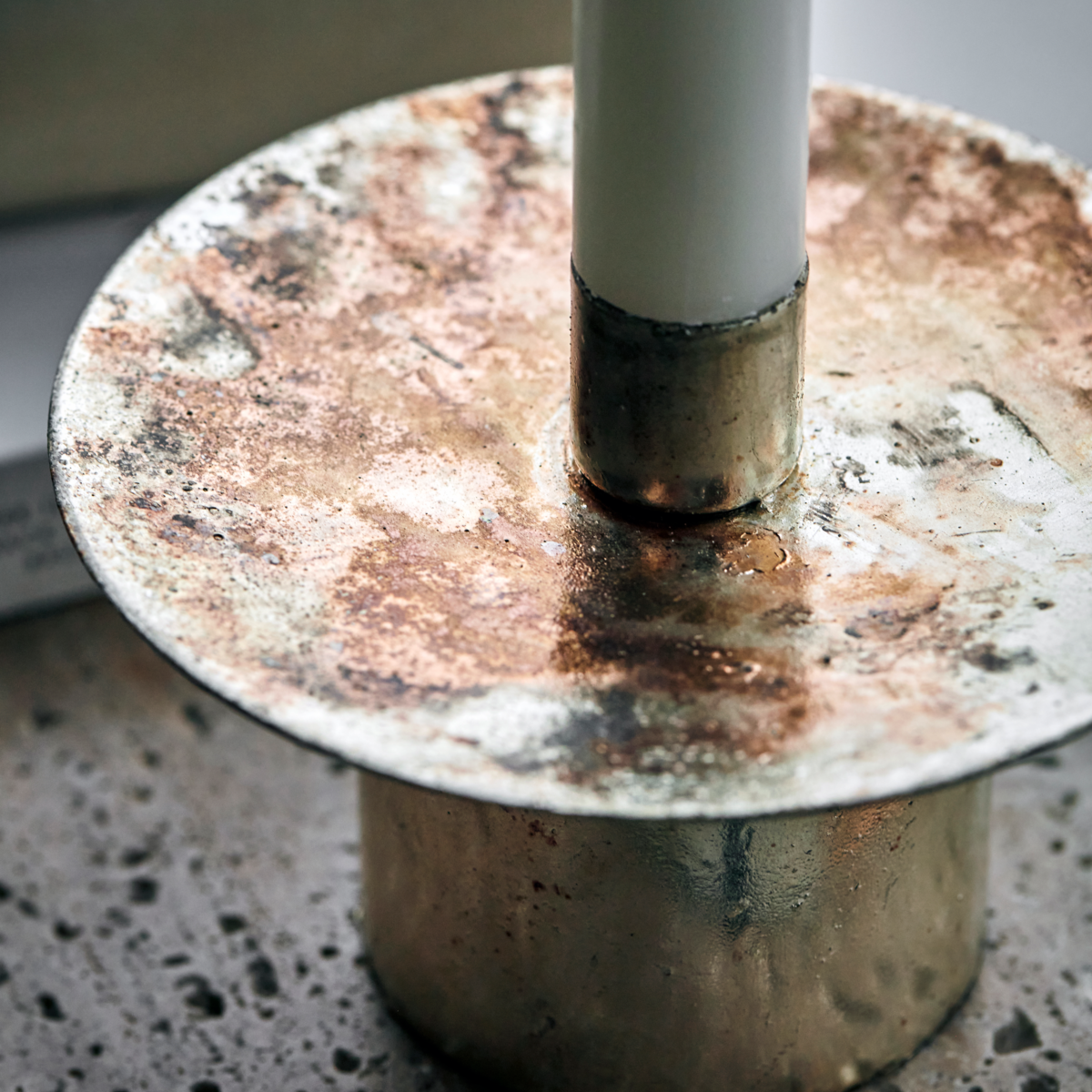 Handgjord med en antik mässingsfinish, tillför denna ljusstake elegans till varje inredning. Dess industriella men moderna design har en unik, skimrande yta, perfekt att kombinera med andra delar i serien.