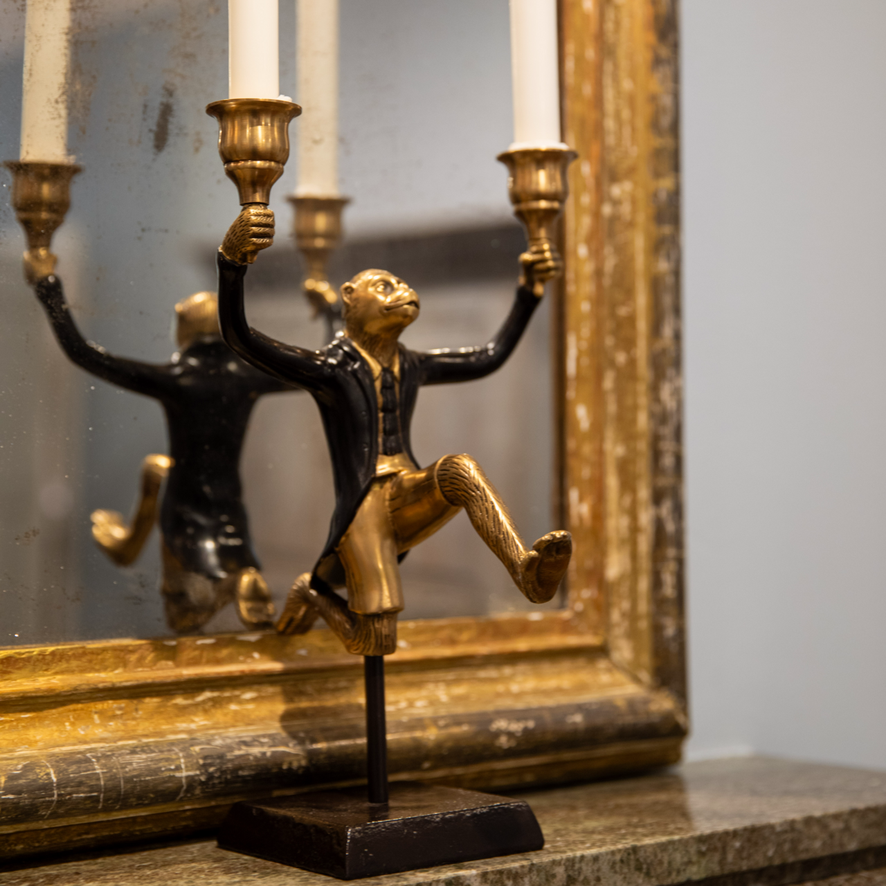 Ljusstake Bertil – dekorativ mässingsljusstake formad som en apa med svart klädsel.