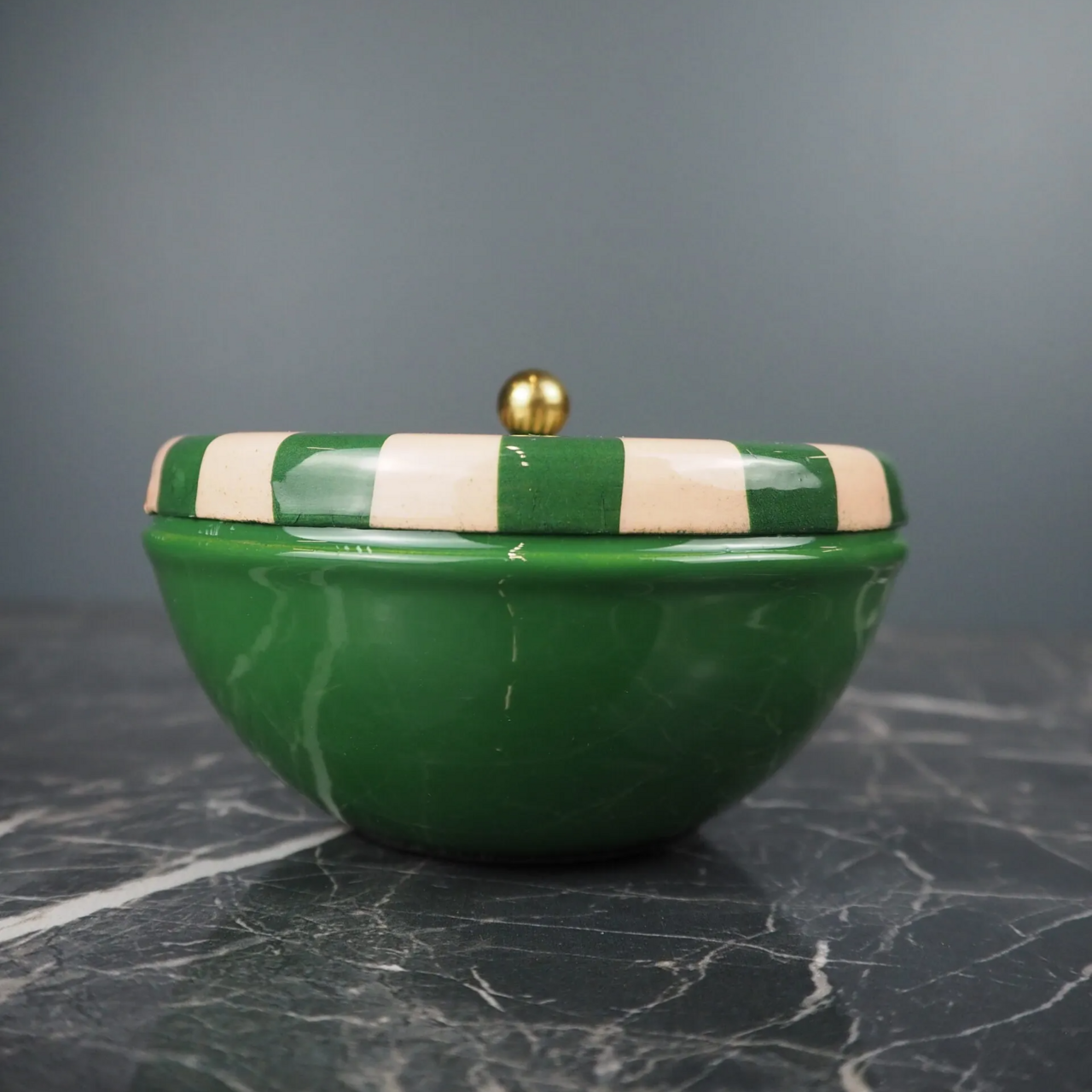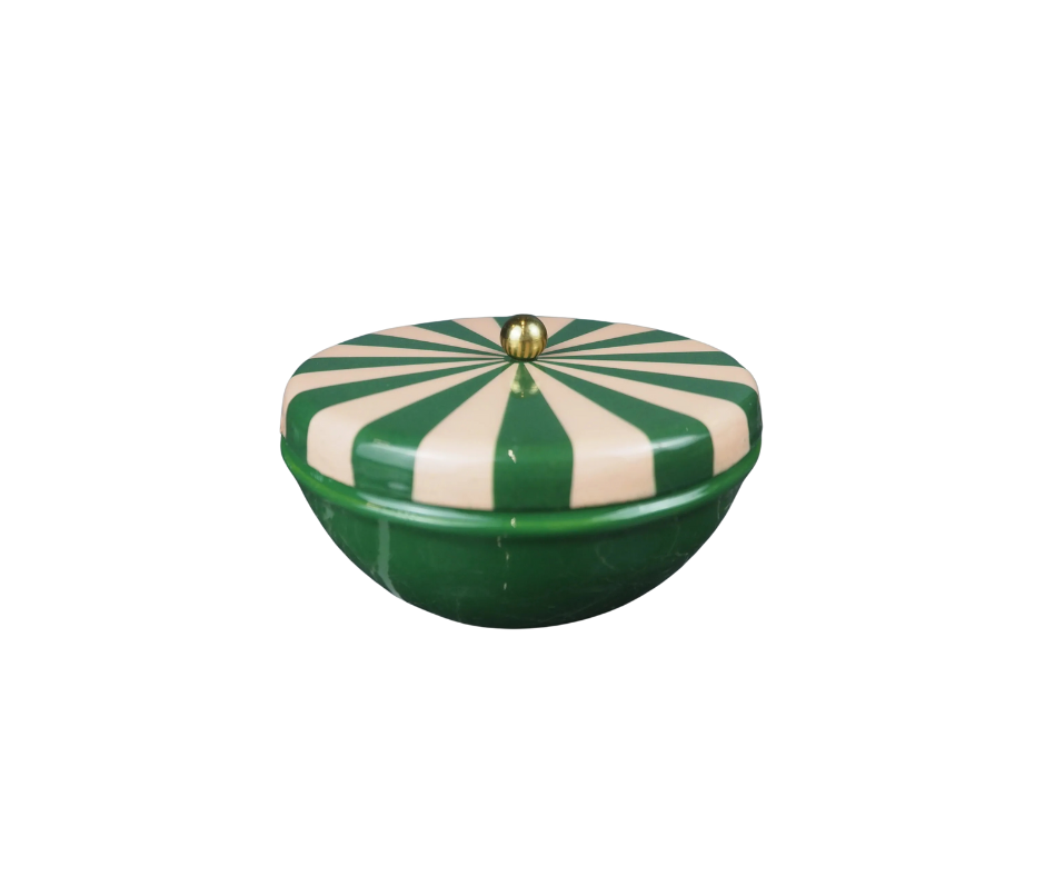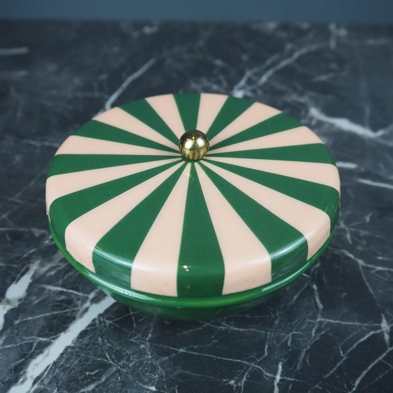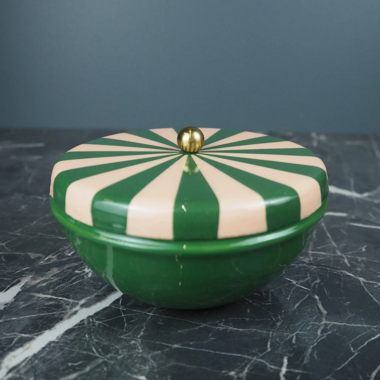 Grön dekorativ ask med randigt lock och guldfärgad knopp.