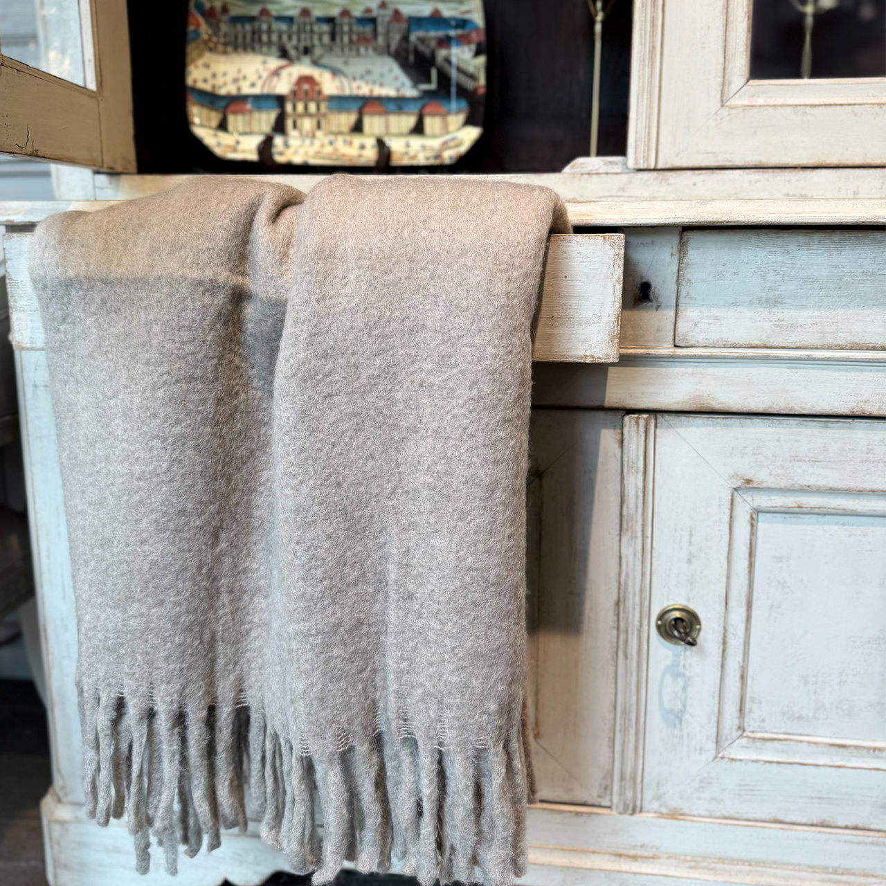 Morris pläd i en kall beige nyans som är handvävd med dekorativa fransar.