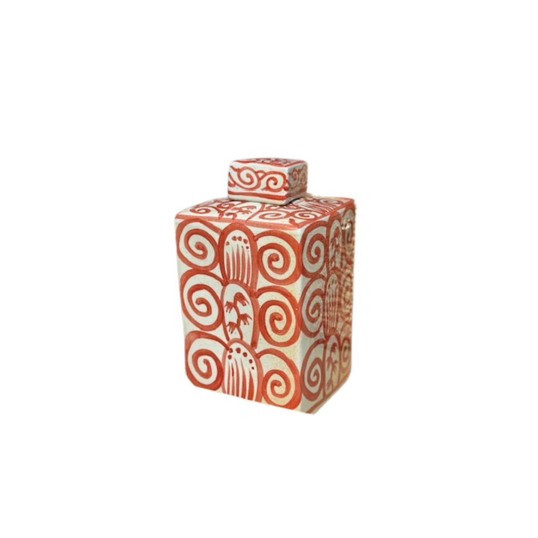 Den eleganta Rödvita asken från Annuzza är en vacker och funktionell burk för förvaring av te, kryddor eller andra småsaker i köket.