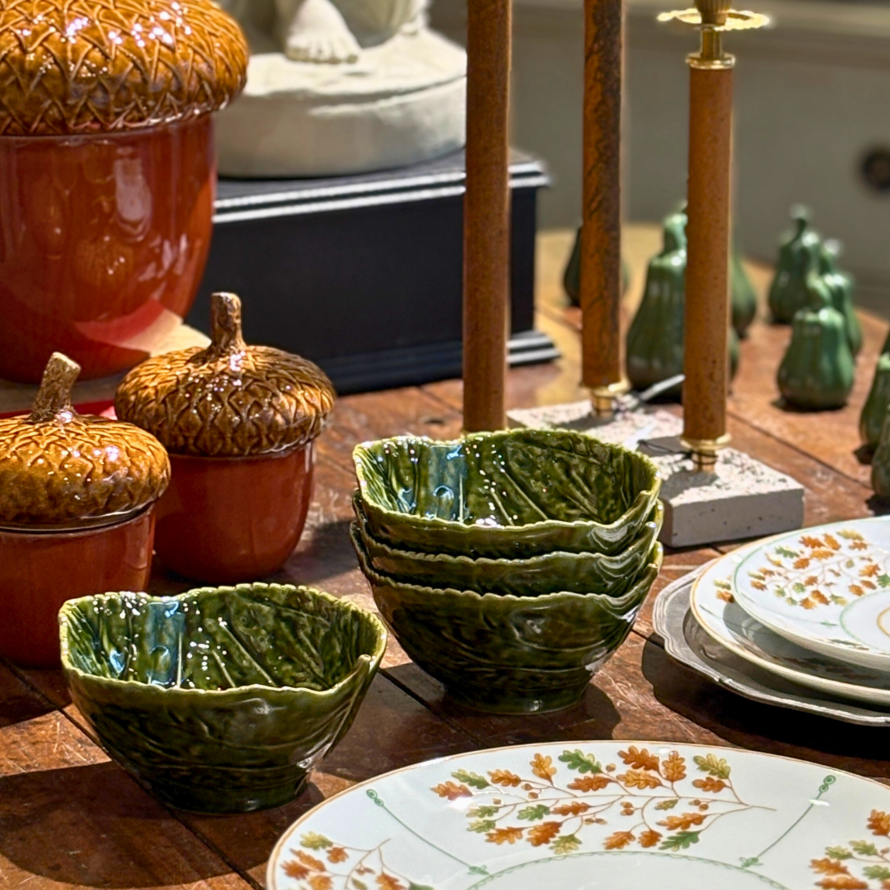 Elegant liten keramikskål i naturinspirerad design från Bordallo Pinheiro. Handgjord i glaserad grön keramik – perfekt för snacks, frukost eller dekoration.