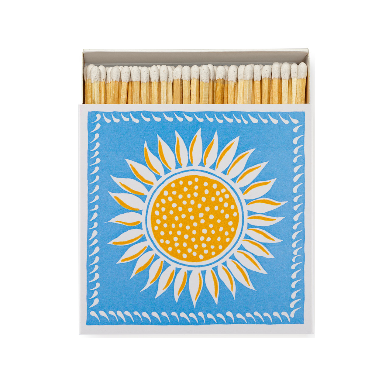Kvadratisk tändsticksask i vacker design. Denna ask har ett charmigt motiv av en solros.