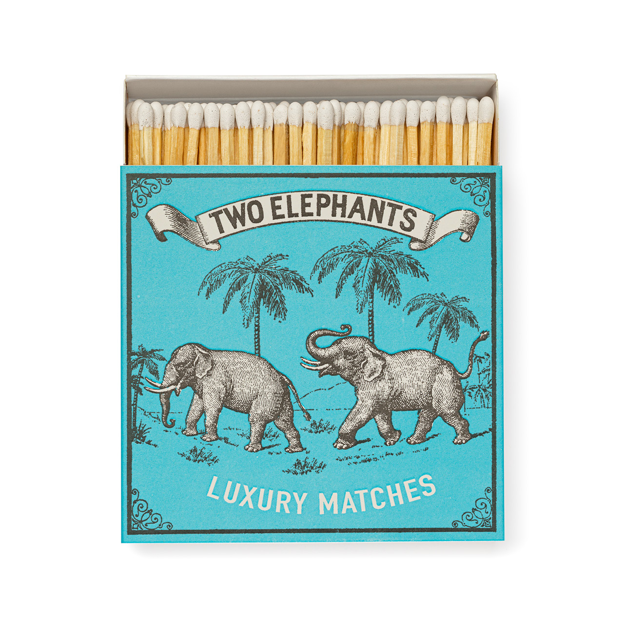 Kvadratisk tändsticksask i vacker design. Denna ask har ett fint motiv av elefanter.