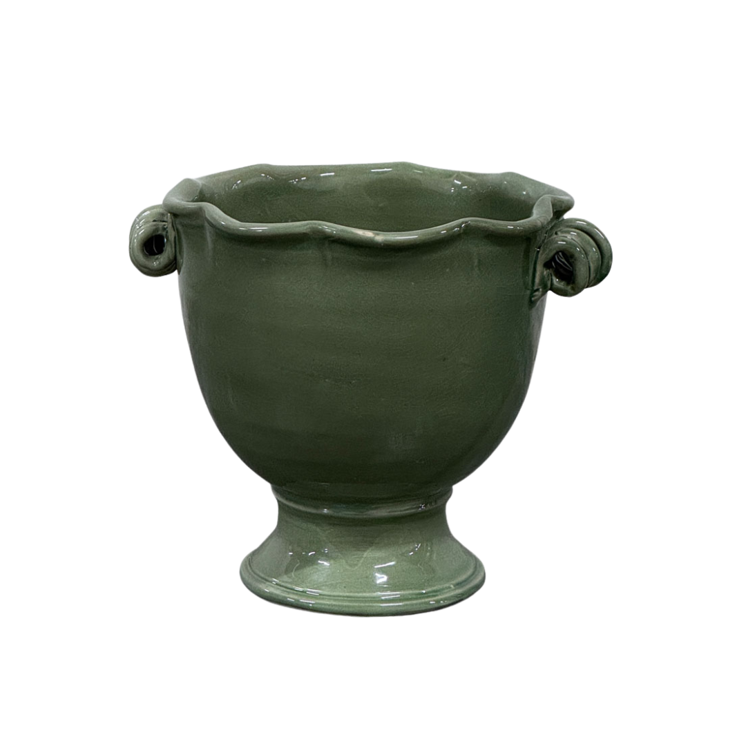 Ge dina växter en stilfull inramning med kruka i grön glaserad keramik. Denna dekorativa kruka kombinerar klassisk form med tidlös design och passar lika bra inomhus som i uterum eller växthus. Den djupa jadegröna nyansen tillsammans med den vågformade kanten skapar ett elegant och harmoniskt uttryck som lyfter både moderna och lantliga miljöer.