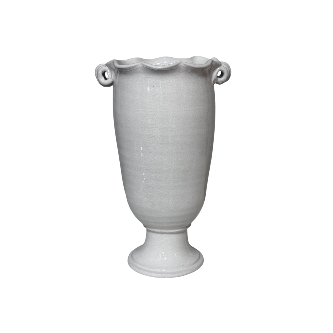 Skapa en ljus och elegant känsla i ditt hem med denna vas i glaserad keramik. Den klassiska formen tillsammans med den mjukt vågade kanten och de dekorativa handtagen ger vasen ett tidlöst och sofistikerat uttryck som passar perfekt i både moderna och klassiska inredningsstilar.